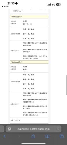 (ABさんの英検結果のスクリーンショット:Eメール問題は全ての項目で3/4点・ライティングは「内容」が満点であることに加え、他の項目が全て3/4点です)